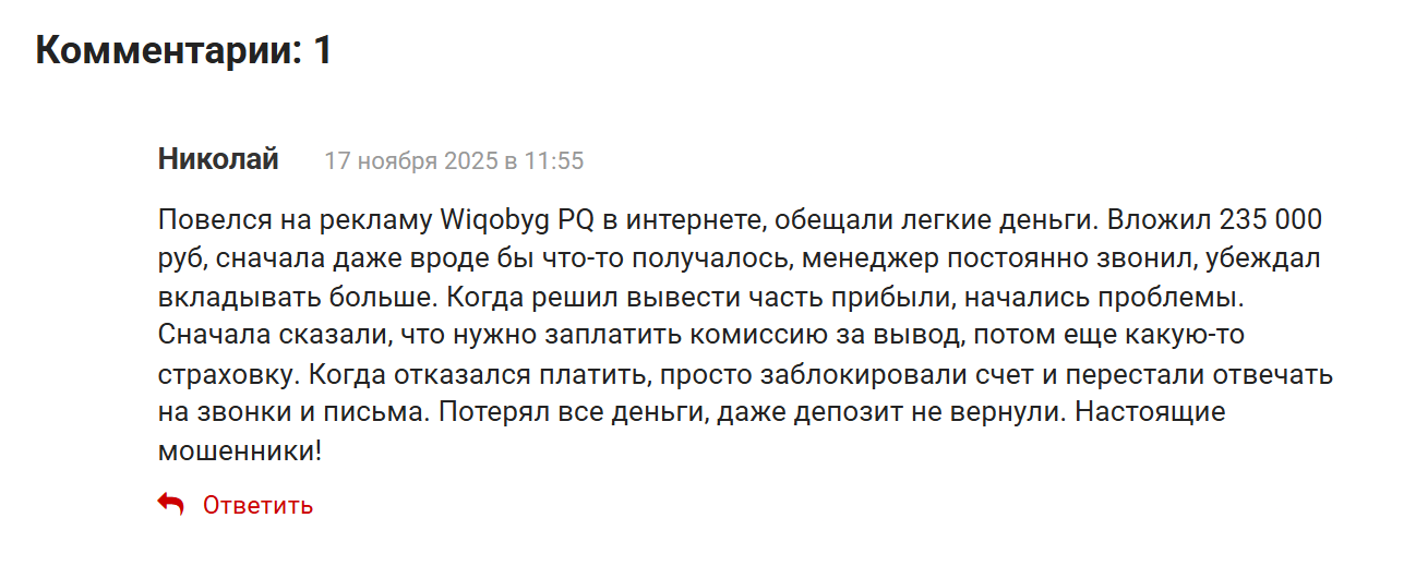 Wiqobyg PQ — это опасная мошенническая схема, маскирующаяся под брокерскую компанию.